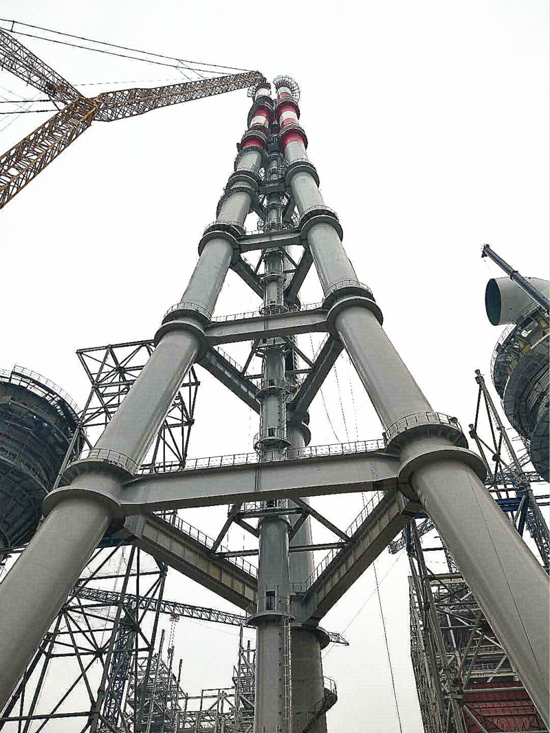 項目配套的三管自立式鋼煙囪,是國能中電引進日本三菱多管自立煙囪技術(shù),并整合了日本鈦板貼襯技術(shù)建設(shè)而成,煙囪內(nèi)徑4.5米,高度180米,分7層,總重2108t。三管自立式鋼煙囪結(jié)構(gòu)合理、造型美觀。三根鋼管煙囪按正三角形布置,通過三角形鋼梁進行剛性連接,形成集束式穩(wěn)定結(jié)構(gòu),每個煙囪由多個直段拼接成流線型曲線。通過整體空間結(jié)構(gòu)來共同抵抗地震荷載、風荷載及其它荷載,整個煙囪結(jié)構(gòu)形體規(guī)則,各向受力均勻,造型簡潔、美觀,全面融入了現(xiàn)代氣息和建筑美學(xué)的設(shè)計理念。自2018年8月12日開始施工建設(shè),采用SCC9000/900噸履帶式起重機分七段進行吊裝,在參建各方的共同努力下,歷時135天,于2018年12月25日順利吊裝到頂。